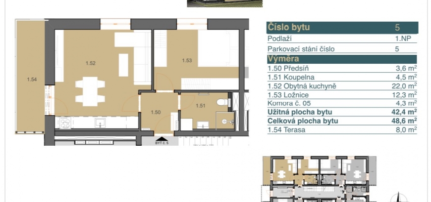 - bytová jednotka č.5, dispozice 2+kk, celková plocha bytu 48,6m2