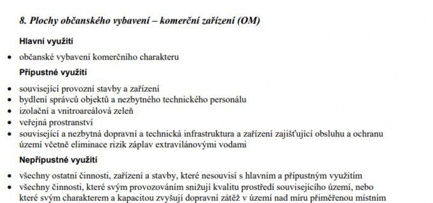 Pozemek je v platném územním plánu obce označen jako OM – plocha občanského vybavení. Jeho využitelnost je omezena stávajícím ÚP obce. Plochy občanského vybavení se obvykle samostatně vymezují za účelem zajištění podmínek pro přiměřené umístění, dostupnost a využívání staveb občanského vybavení a k zajištění podmínek pro jejich užívání v souladu s jejich účelem. Plochy občanského vybavení zahrnují zejména pozemky staveb a zařízení občanského vybavení pro vzdělávání a výchovu, sociální služby, péči o rodinu, zdravotní služby, kulturu, veřejnou správu, ochranu obyvatelstva. Dále zahrnují pozemky staveb a zařízení pro obchodní prodej, tělovýchovu a sport, ubytování, stravování, služby, vědu a výzkum, lázeňství a pozemky související dopravní a technické infrastruktury a veřejných prostranství.